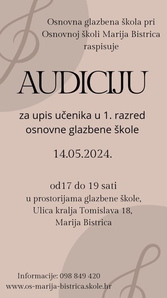 Audicija i upis će se održati u prostorijama škole u Ulici kralja Tomislava 18, u Mariji Bistrici. U utorak 14. svibnja, od 17 do 19 sati održat će se audicija, a od 19.30 sati upisi.