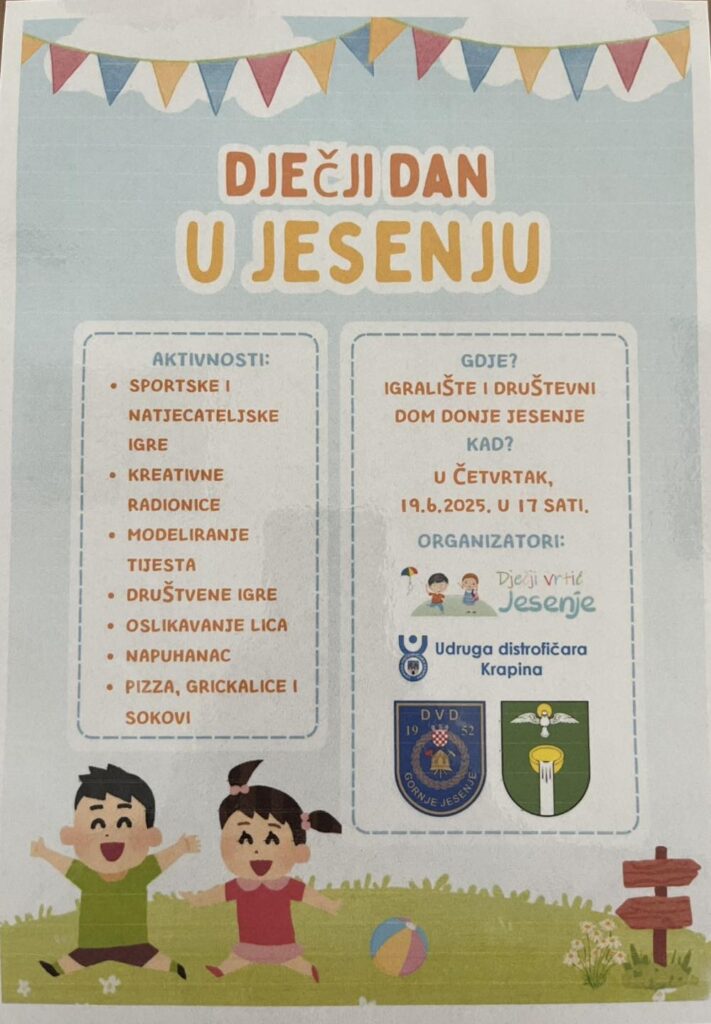 Donje Jesenje uskoro će postati pravo središte dječjeg veselja! U četvrtak, 19. lipnja 2025. godine, s početkom u 17 sati, na igralištu i u društvenom domu Donje Jesenje održat će se veseli Dječji dan, koji će zasigurno razveseliti i male i velike.
