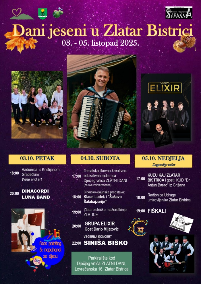 U subotu 04.listopada u 17:00h Dječji vrtić ZLATNI DANI, za sve zainteresirane pripremio je tematske likovno-kreativno-edukativne radionice. U 18:00h najmlađe će razveseliti cirkusko-klaunska predstava Klaun Ludek i Šašavo šalabajzanje. U 19:00h očekuje vas nastup Zlatarbistričkih mažoretkinja Zlatica, a pravo zagrijavanje slijedi u 20:00h sa grupom Elixir te gostom Dariom Mijatovićem. U 22:00h očekuje vas nezaboravan koncert Siniše Biška.